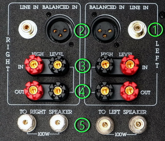 ① Line In: - The RCA inputs for the stereo Left and Right channels, mainly connected from the home hi-fi equipment such as pre-amplifier, DVD players, and so forth. ② Balanced In: - The XLR inputs for the stereo Left and Right channels through balanced cables, mainly connected from the professional audio equipment, PA system, or some hi-end preamplifier. ③ High Level In,④ High Level Out: - When you decide to use your own high-quality amplifier for driving Ultrumax-U1a/-U2a/-M1 speakers; first connect speaker cables from amplifier output to corresponded L/R terminals ③, then use another pair cable to connect Ultrumax-U1a/-U2a/-M1 speakers from the terminals ④. - This is the case that Ultrumax-Sub-Ia used as a simple sub-woofer to reproduce deep bass signals lower than 200Hz frequencies; and the power output ⑤ may be skipped. ⑤ Left/Right Channel Output: - Stereo or two-channel output terminals driven by two build-in high quality 100 Watts digital power amplifiers; connect the corresponded speakers through cables. Sub-I/IIa Electronics Module, Total Panel:
